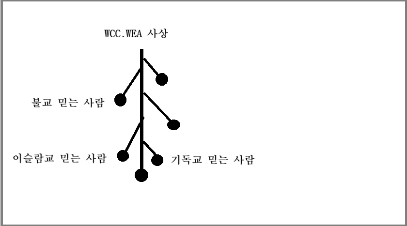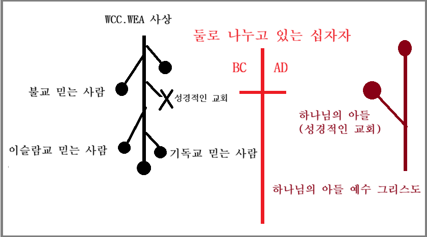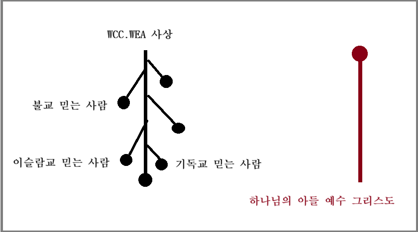 이 세상 창조시에 하나님으로 창조된 아담으로 말미암은 사람들 중에 어떤 사람은 부처와 불교라는 종교를 믿고 어떤 사람은 알라와 이슬람교라는 종교를 믿고 어떤 사람은 예수님(하나님)과 기독교라는 종교를 믿는다는 사상을 가진 WCC.WEA이다. 이 같은 WCC.WEA 사상이 맞아 보이지만 이 사상에 미혹 당하게 되면 예수님을 믿는다는 우리 교회가 그만, 첫째, 이 세상에 속한 것이 되고 둘째, 이 세상 창조시에 하나님으로 부터 지으심을 받은 아담으로 말미암은 사람이 되고 셋째, 기독교라는 종교가 되고 만다. 넷째, 예수님을 믿는 교회라는 우리가 부처와 불교라는 종교를 믿는 사람이나 알라와 이슬람교라는 종교를 믿는 사람과 같은 사람이 되고 만다.