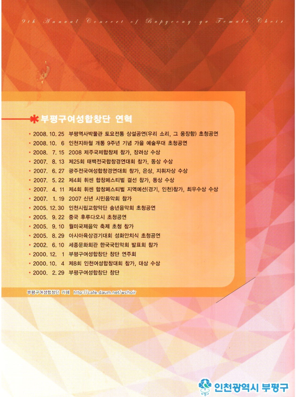 부평구여성합창단 연혁 작성자안정주|작성시간09.02.10|조회수303 목록 댓글 1 글자크기 작게가 글자크기 크게가 다음검색 현재 게시글 추가 기능 열기 북마크 공유하기 신고 센터로 신고 댓글 댓글 1 댓글쓰기 답글쓰기 댓글 리스트 작성자김공연 | 작성시간 09.02.11 아이디어 머쪄부러요~~연혁 나온거 보관해 놓았다가 요렇고럼 써먹는 쎈~~스 굿임다. 댓글 전체보기