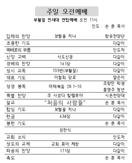 2024년 부활주일 예배 (2024.03.31.) 작성자김형배|작성시간24.04.01|조회수30 목록 댓글 0 글자크기 작게가 글자크기 크게가 2024년 부활주일 예배 (2024.03.31.) 오전11시 성찬식, 부활卵 나누기, 목사님 생신 잔치 다음검색 현재 게시글 추가 기능 열기 북마크 공유하기 신고 센터로 신고 댓글 댓글 0 댓글쓰기 댓글 리스트