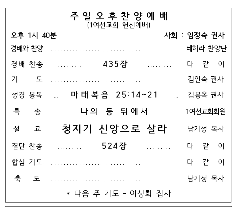 제1여선교회 헌신예배 (2023.05.21 주일 오후2시) 작성자김형배|작성시간23.05.21|조회수22 목록 댓글 0 글자크기 작게가 글자크기 크게가 제1여선교회 헌신예배 (2023.05.21 주일 오후2시)강사 : 남기성 목사(서원감리교회) 다음검색 현재 게시글 추가 기능 열기 북마크 공유하기 신고 센터로 신고 댓글 댓글 0 댓글쓰기 댓글 리스트