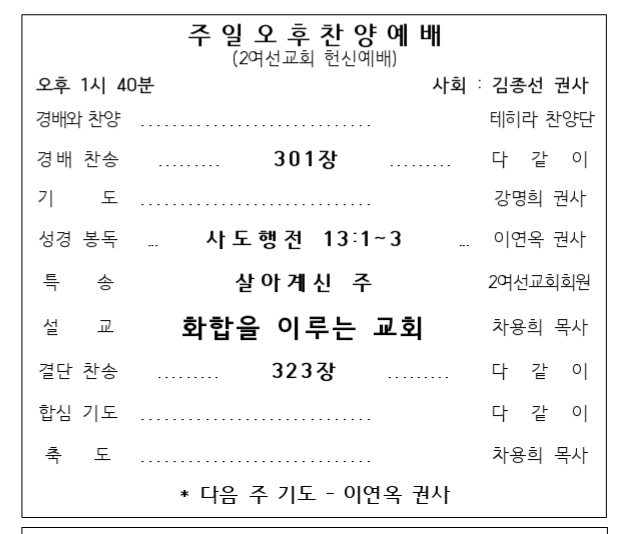 제 2여선교회 헌신예배 (2023.06.18 주일 오후2시) 작성자김형배|작성시간23.06.18|조회수25 목록 댓글 0 글자크기 작게가 글자크기 크게가 제 2여선교회 헌신예배 (2023.06.18 주일 오후2시)강사 : 차용희 목사 (아펜젤러감리교회) 다음검색 현재 게시글 추가 기능 열기 북마크 공유하기 신고 센터로 신고 댓글 댓글 0 댓글쓰기 댓글 리스트