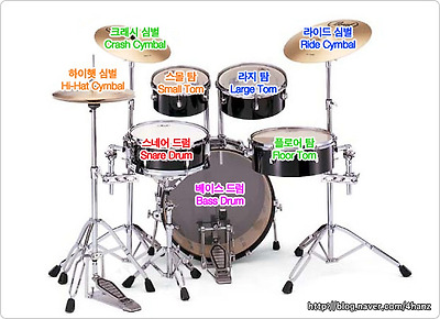 기본으로 하며 크래쉬 심벌(Crash), 라이드 심벌(Ride), 탐탐(Tom Tom)이 추가 구성된다.