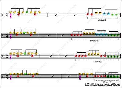 드럼 악보 읽는 법이 마치 다양한 것처럼, 느낌(Fill)이 가는데로 직접 구분하여 치는 방법 밖엔 없다;;;