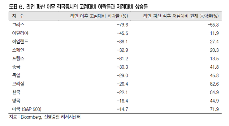 실제로 2008 년 리먼 파산 당시의 주가 저점과 비교할 때 프랑스나 이탈리아는 10% 정도의 갭으로 축소된 상태이다.