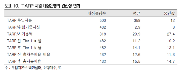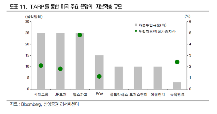 미국의 경우에는 TARP 를 기반으로 부실자산과 은행 우선주를 매입하여 자본확충을 지원했다.