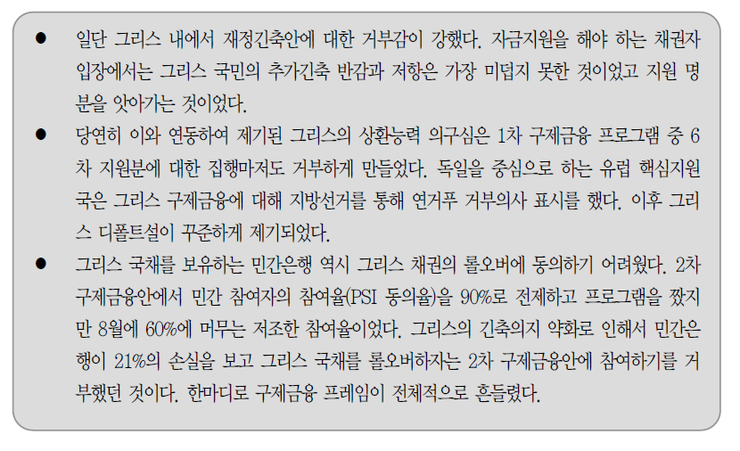 지난 7 월 21 일에 트로이카(IMF, ECB, EU)는 그리스 2 차 구제금융안을 합의하였지만 불행하게도 협의한 대로 추진하는데 많은 난관이 뒤따랐다.