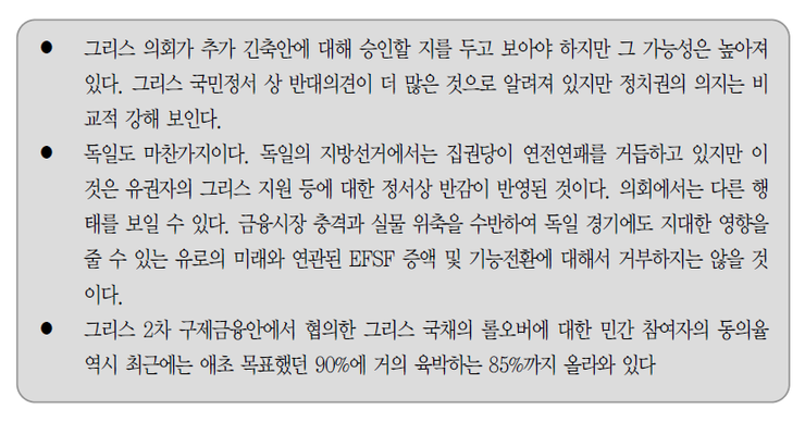 그리스의 긴축안 거부와 독일의 지원승인 지연 등으로 그리스 디폴트나 채무조정 확대 방안 등이 거론되었지만 그리스 긴축안 승인이나 독일 지원 등이 가시화된다면 추진될 수 있는 현실적인 대안 중 하나이다.