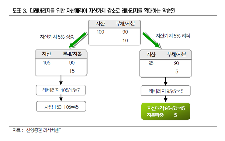 레버리지를 낮추기 위한 자산매각이 레버리지를 높이면 더욱 자산매각을 하게 되는 악순환에 빠지는 것이다.