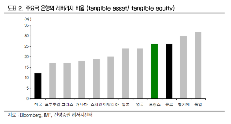 유럽은행은 미국 은행에 비해 레버리지 비율이 2 배 이상이다.