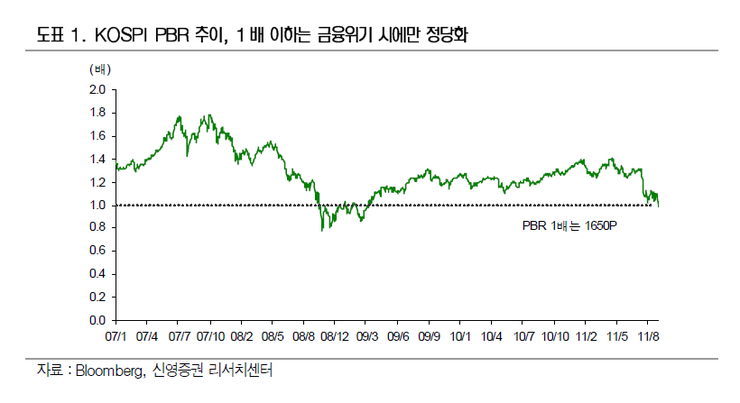 유럽 금융시스템 위기가 파국으로 이행하지 않는다는 확신이 선다면 증시가 PBR 1 배 이하로 하락할 이유가 없다.