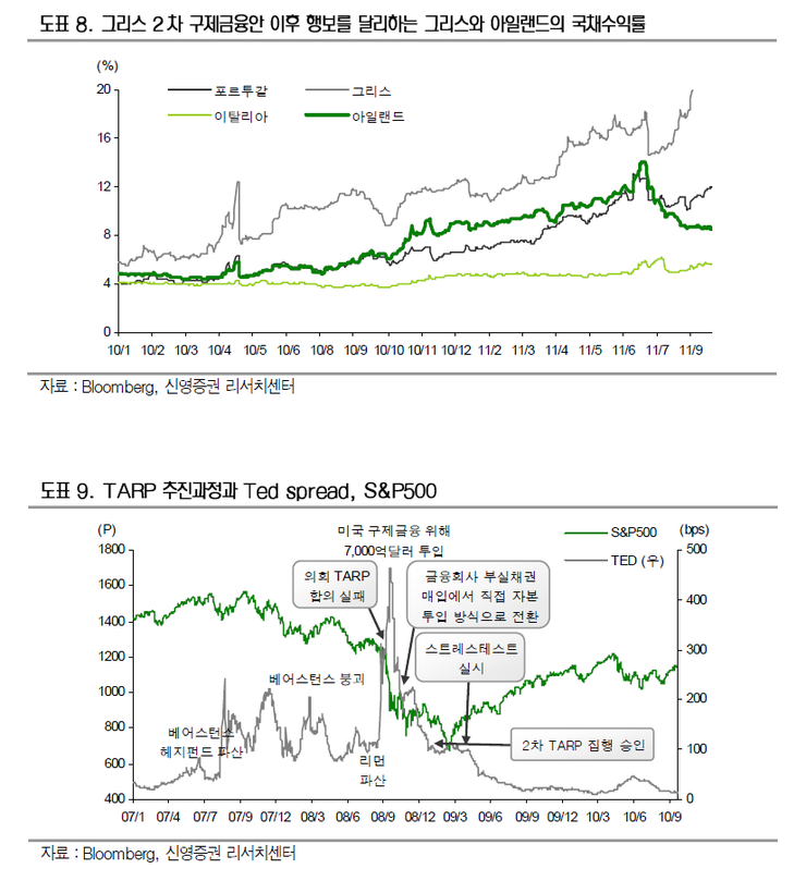 2) EFSF 등이 개입하면서 유럽은행 증자가 원활하게 이루어지면 미국의 금융위기 시에 TARP 시스템이 작동하면서 증시가 안정을 되찾은 것처럼 유럽 금융시장 패닉도 빠르게 진정될 것으로 기대된다.