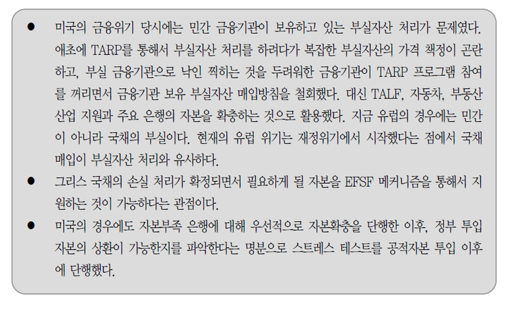 다만 당시에는 일부 금융기관들이 파산 지경에 이르자 TARP 가 동원되었는데, 현재 유럽이 그러한 경로, 즉 은행이 파산지경에 이르고 나서 자본확충을 해야 할 것인가 하는 의문이 남는다.