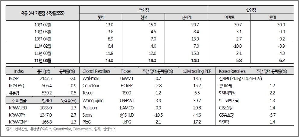 • 백화점은 4월 세일효과로 전 상품군 두 자리수 매출 확인(명품 3사 평균 40%대 신장, 혼수영향 주방가전 30%대)