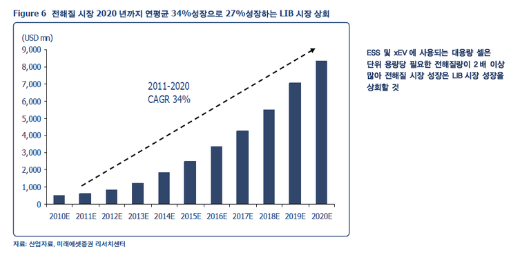 단위 사용량이 크게 증가하므로 단가 인하 압력을 감안해도 2020 년까지 전해질 시장 성장은 리튬이온전지의 연평균 성장률 27%를 상회하는 34%에 이를 것임.