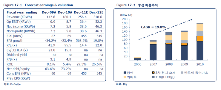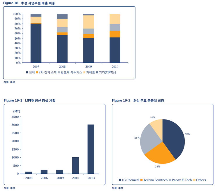 후성은 국내 유일의 리튬 이온 2 차전지용 전해질(LiPF6) 제조 업체로 2010 년부터 리튬 2 차전지 세계 시장 규모 증가에 따른 생산능력을 확대하고 있으며 2 차전지 소재의 지속적 성장과 함께 차세대 친환경 사업분야의 비중을 확대해 가고 있다.