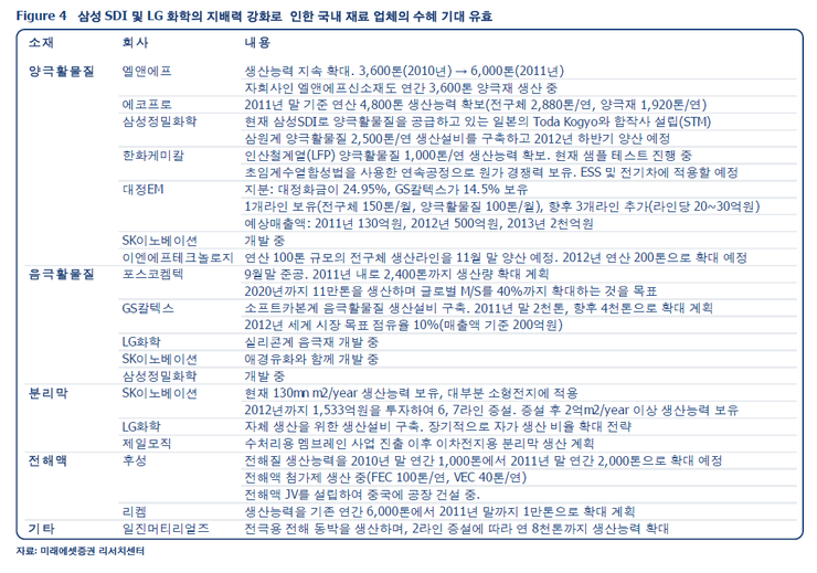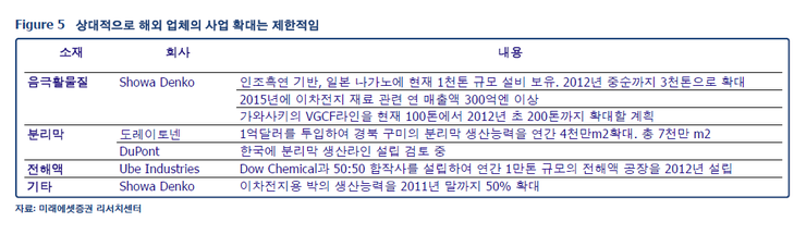 2) 경쟁업체가 일본업체이므로 리튬이온전지 원재료의 탈 일본화 경향 수혜를 기대할 수 있어 해외 시장에서의 지배력 상승을 기대할 수 있을 뿐 아니라,