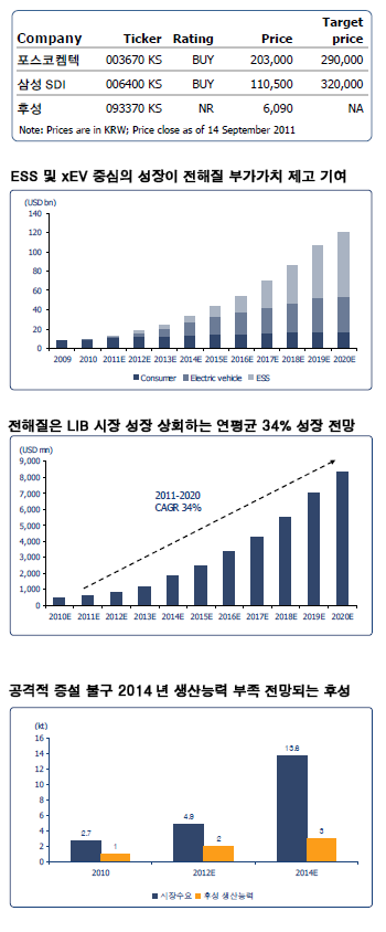 3) 동일본 대지진 이후 리튬이온전지 시장에서 원재료의 탈 일본화가 진행되고 있는데 후성을 제외한 3 개 업체가 일본업체라는 측면에서 점유율 상승을 기대할 수 있다는 것 등이다.