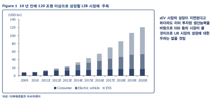 LIB 시장이 향후 10 년간 120 조원 규모로 큰 성장을 함에 따라 관련 재료 시장도 60 조원 이상으로 성장할 것이다.