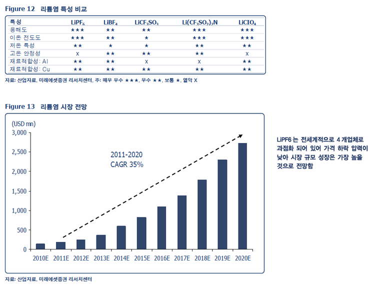LiPF6 는 제조상 어려움이 있는 반면, 시장 규모가 2 억달러 규모에 불과해 4 개 업체로 과점화 되어 있어 2 차전지 재료 중에서 가장 안정된 가격을 보이고 있다.