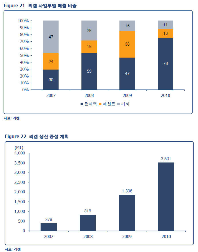 불순물에 대한 민감도가 높아 리튬염에 금속성 불순물을 제거해야 하는 과정도 부가가치가 높은 과정으로 성공적으로 리튬염의 순도를 높여 공급하게 될 경우 리켐의 평가를 재고하는 것에 도움이 될 것으로 판단한다.