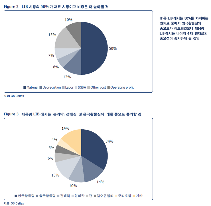 현재 전체 LIB 시장에서 재료가 차지하는 비중은 50% 수준이지만 xEV 및 ESS 등 배터리가 대형화 되면 재료비 비중은 더 높아 질 수 있을 것이다.