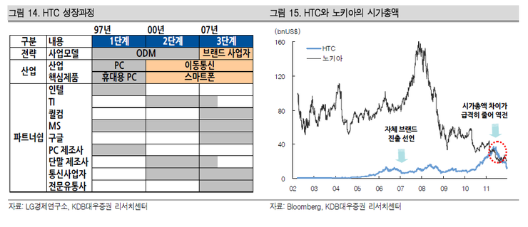 이미 세계 휴대폰 시장점유율 1위 노키아의 시가총액을 넘어선 글로벌 기업으로 성장한 HTC는 이러한 도약이 회사 창립 후 불과 15년만에 이뤄진 업적으로 자체 브랜드의 성공 뒤에는 고객별 맞춤 개발을 하는 ODM 사업이 근간이 되었다는 판단이다.