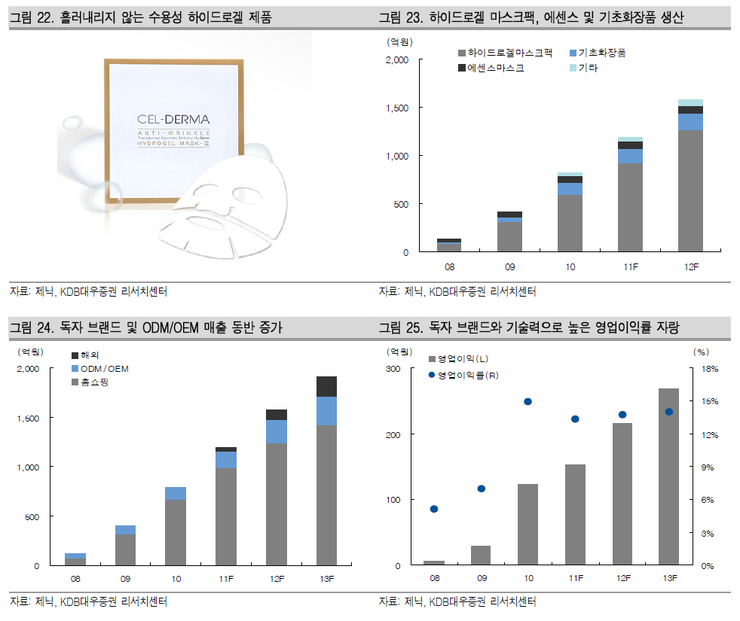 대형 화장품 회사와 주문 생산 전문의 ODM/OEM 기업으로 구분되는 국내 화장품 시장에서 하이드로겔 기술을 바탕으로 독자브랜드와 홈쇼핑 채널을 통한 판매까지 하고 있는 강소 기업으로 빠르게 성장하고 있다.