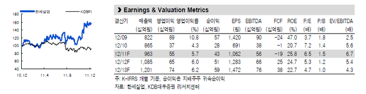 2012년 한세실업은 전년대비 12.6% 성장해 1조원의 고지를 돌파할 것으로 보인다.