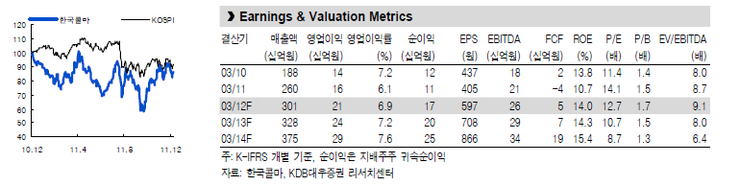 벤치마크 KOSPI 지수와 한국콜마의 주가를 상대 비교해 보면, 2008년 하반기 금융위기나 2011년 지수 조정시기에 KOSPI 대비 선방하는 모습을 보이고 있다.