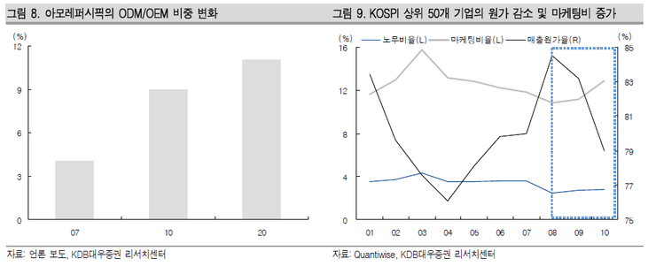 실제로 아모레는 2007년 전체 제품 생산의 4%에 불과했던 ODM 비중을 2010년 9%까지 높였고, 2020년에는 11%까지 확대할 계획이라고 발표했다.