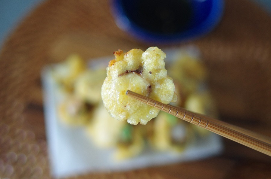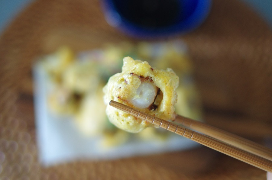카레+찹쌀가루 묻힌 문어를 반죽에 넣고 튀겨냅니다