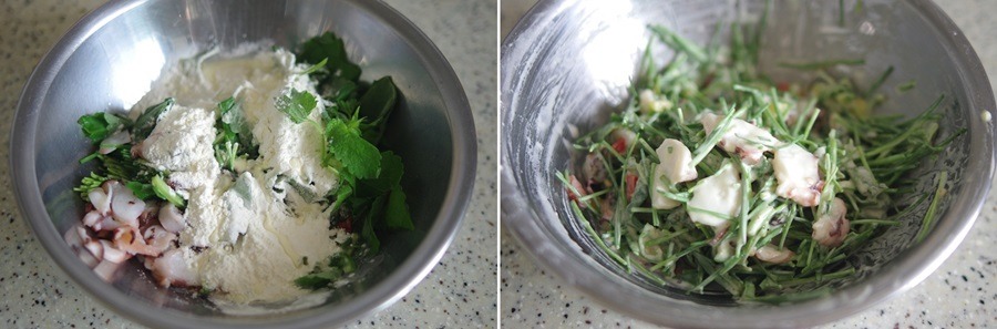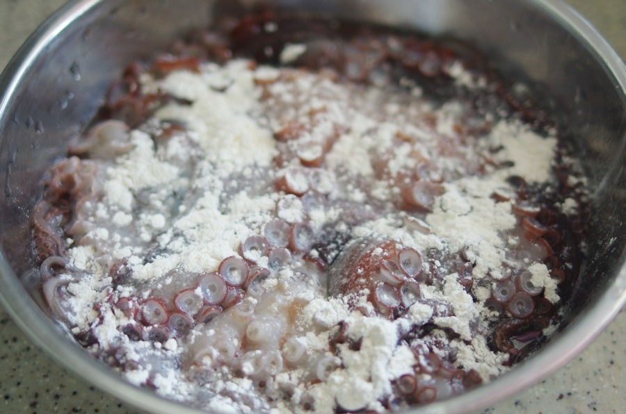 찹쌀가루와 카레가루를 섞어 한입크기로 자른 문어를 넣고 쉐잌쉐잌~