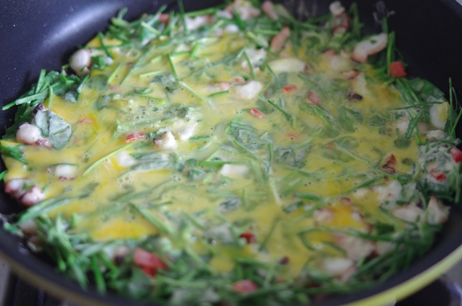 후라이팬에서 굽다가 적당히 익었다 싶을때 계란을 위쪽에 두릅니다~~~