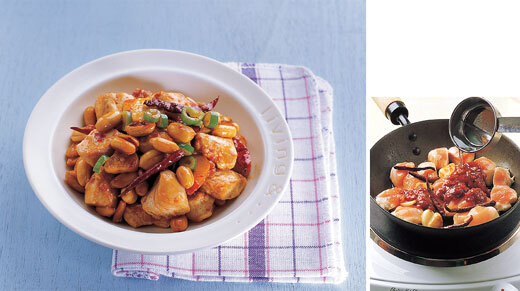 ● 재료 닭가슴살 2쪽, 땅콩 1컵, 태국고추 5개, 마늘 2쪽, 대파 1/5대, 식용유 약간, 닭살 밑양념(생강즙 2큰술, 소금·흰후춧가루 약간씩), 볶음소스(두반장 2큰술, 청주·물엿 1큰술씩, 물 1/3컵)