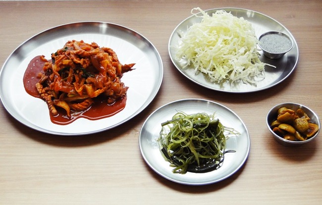 1시간 조금 안되는 시간동안 오징어볶음, 미역줄기 볶음, 양배추 샐러드와 드레싱을 만들고 나니