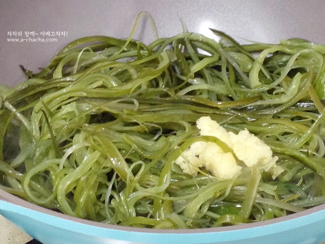 달군 팬에 참기름 2스푼 두르고 미역줄기 넣고 맛술 반스푼, 마늘 한스푼 넣고 달달 볶아주세요.