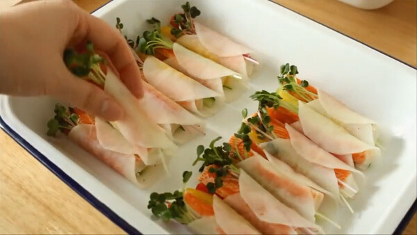 생일상, 잔칫상에 많이 오르는 무쌈말이도 대표적인 무 요리 가운데 하나다. 무쌈말이는 대부분 시판용 무쌈을 이용해 만들지만, 직접 만든 무쌈을 사용해도 좋다. 보통 무쌈말이에는 가늘게 채 썬 오이와 당근, 파프리카, 달걀 지단이 기본으로 들어가고 여기에 새싹채소나 쇠고기, 닭 가슴살, 훈제오리 등을 함께 넣으면 더욱 맛있게 먹을 수 있다. 무쌈말이는 어떤 재료를 넣어 먹느냐에 따라 칼로리가 달라지기 때문에 다이어터라면 육류 및 양념을 줄여 섭취하는 것이 좋다.