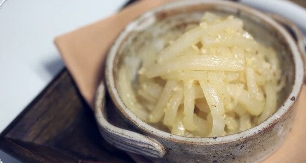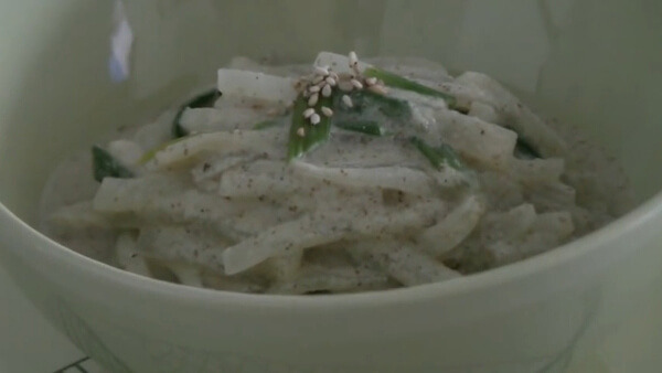 남녀노소 누구나 입맛에 맞게 맛있게 먹을 수 있는 무 요리, 무 들깨 볶음도 있다. 달군 팬에 들기름을 넣은 후 채 썬 무를 넣어 달달 볶아준 다음 죽염 또는 소금으로 간을 하고 무가 투명해질 때까지 볶아준다. 여기에 들깨와 찹쌀을 넣어 곱게 간 물을 체에 걸러 내려주고, 함께 볶아주면 된다. 찹쌀가루가 눌어 붙지 않도록 저어준 후 마지막에 송송 썬 대파를 넣어주면 된다. 맛도 있지만 모습이 크림파스타와 비슷해 먹는 즐거움을 더해준다.