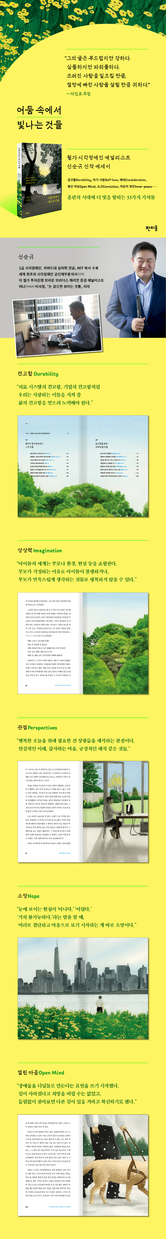 삶의 위기를 견딜 뿐만 아니라, 나아가 의미 있는 삶을 살기 위해서 저자는 스스로 견고함을 ‘선택’해야 했다고 말한다. 도전을 두려워하지 않고 지치지 않는 긍정의 근육을 기르려 애썼고, 불가능할 거란 주변의 우려에도 강인한 소망을 품고 이를 삶으로 증명했다. 『어둠 속에서 빛나는 것들』은 생각, 가치관, 마음가짐, 믿음 등에서 우러나오는 내적 견고함을 갖춘 한 인물의 스토리를 통해, 그러한 삶을 온전히 살아낸 사람만이 할 수 있는 진정한 희망과 위로를 전한다.