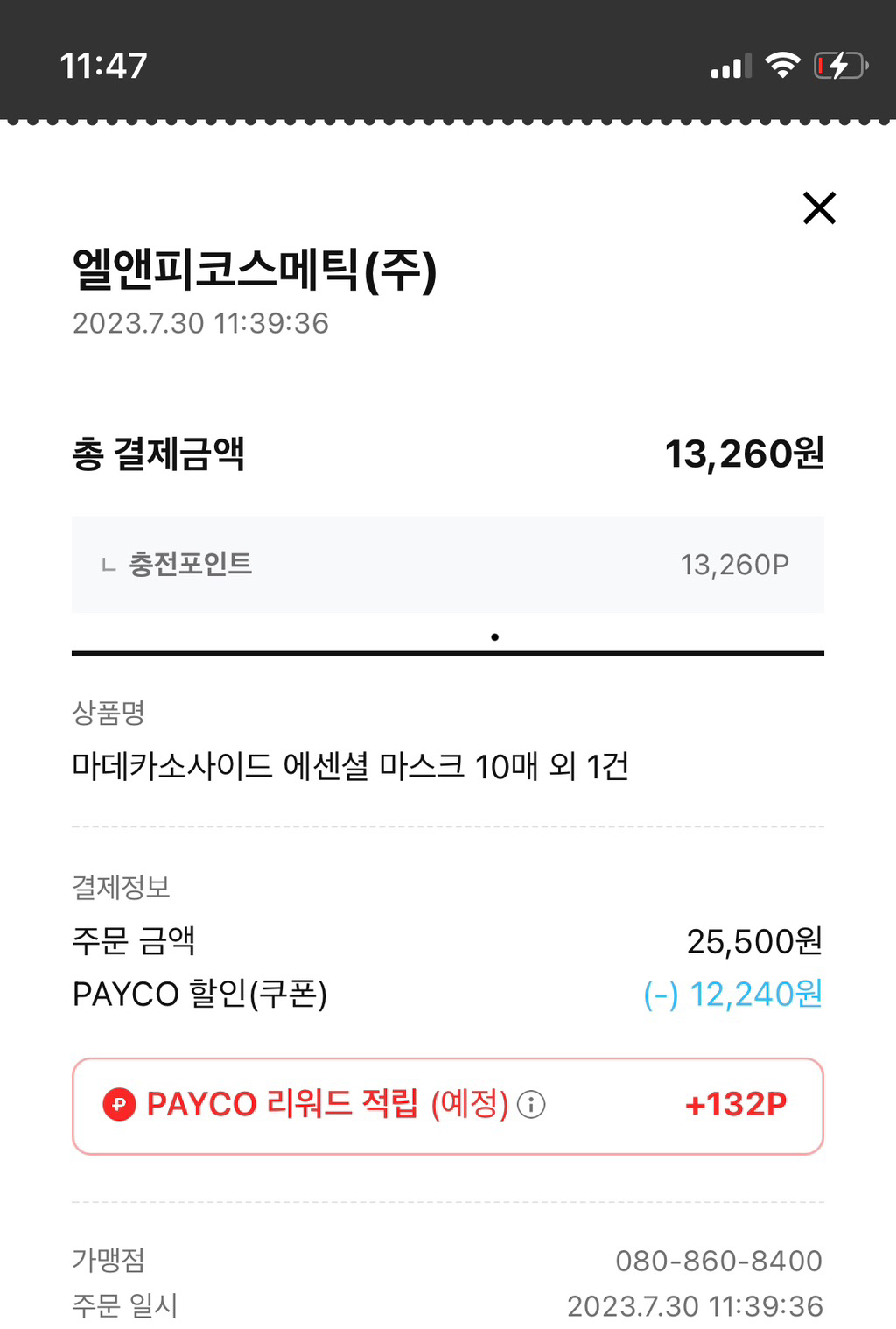 3만원치 담았고 총 결제 금액은 13,260원