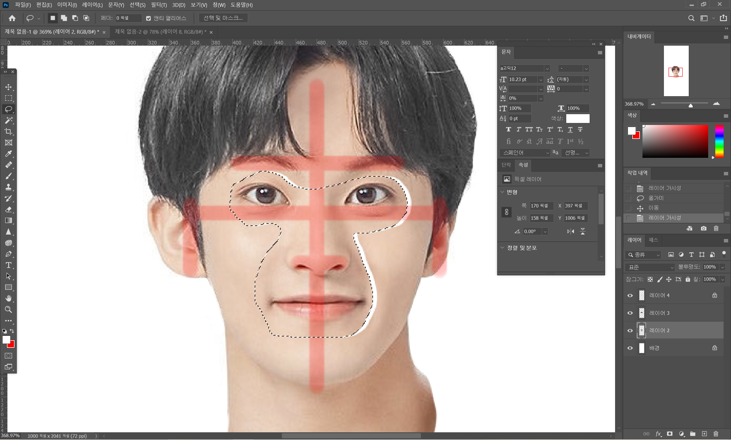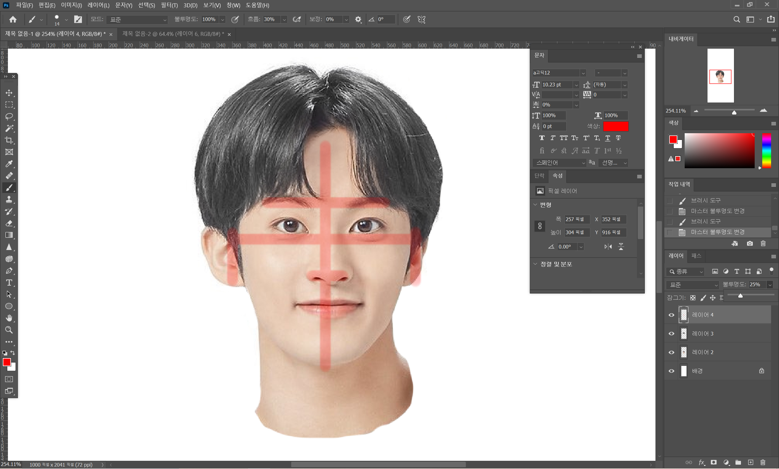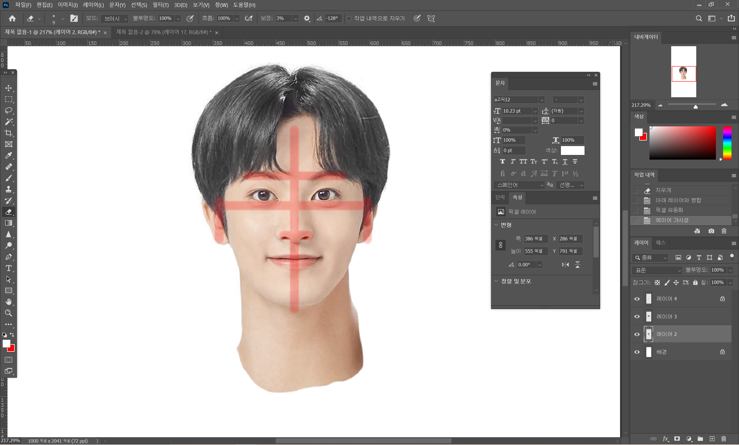 사진관가면 뭐 턱들어주세요 고개 살짝 옆으로~ 이러잔아여 이게 다 대칭을 맞추기 위함인데 아무리 포샵으로 해도 대칭 자체가 너무 삐뚤어졌으면 맞추기 힘들다는게 학계의 정설,,,, 그러나 우리는 무에서 유를 창조해야하기에 이렇게 가이드 라인을 그려줍니다 (새레이어 만들고 브러쉬로 그려주세요 쉬프트 누른 상태에서 직선 찍 그으면 저래 됩니다)