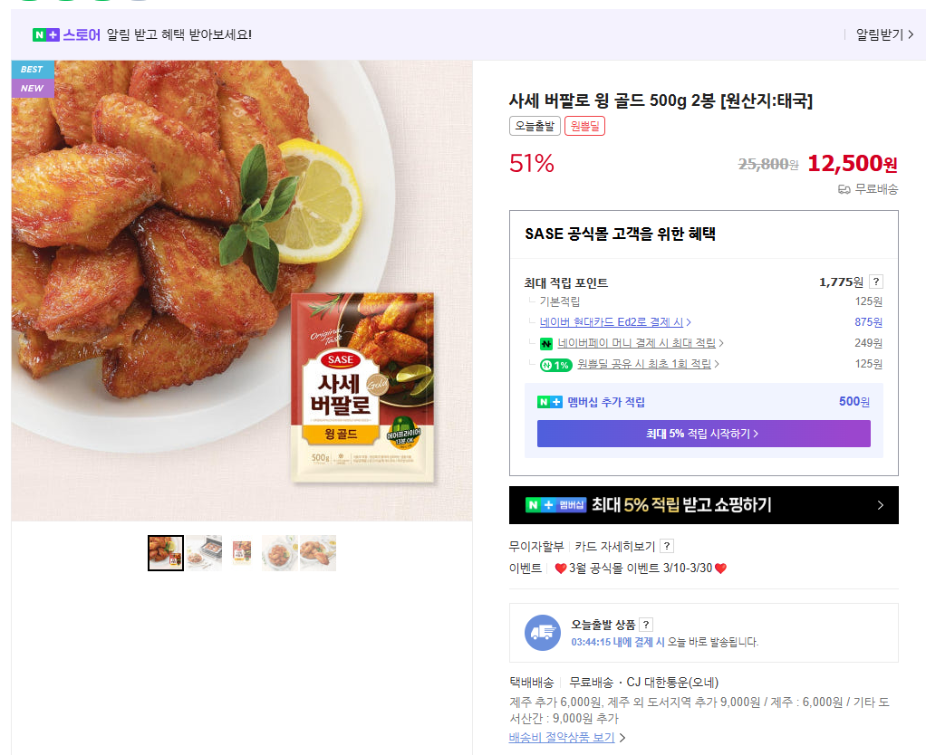 [할인]사세 버팔로 윙 골드 500g 2봉 12,500원 무배 (유통기한 5월 9일까지) 작성자아이원트부자|작성시간25.03.11|조회수677 목록 댓글 12 글자크기 작게가 글자크기 크게가 유통기한 임박상품 (5월 9일까지)보통 500g이 10,000~12,500원 정도 하니까 찐 반값~! https://plusdeal.naver.com/smartstore?esk=9o26%2F9ER%2BpP3MHATZoxDYbvp6q7ft4uD6EVyApgBA4FWvo%2FhndQj6dOSZ6yMaqfT6Ra8Mnm%2Brks%3D 다음검색 현재 게시글 추가 기능 열기 북마크 공유하기 신고 센터로 신고 댓글 댓글 12 댓글쓰기 답글쓰기 댓글 리스트 작성자채피마르소 | 작성시간 25.03.11 샀다 땡큐~~~! 작성자Kim YeonKoung | 작성시간 25.03.11 고마워!! 작성자메이팔세럽 | 작성시간 25.03.11 고마워~~ 작성자텔레토비이 | 작성시간 25.03.11 바로 샀다!! 고마워 작성자디오니소스 말고 굴소스 | 작성시간 25.03.11 사이트 터졌나?!?왜 안들어가지지 댓글 전체보기