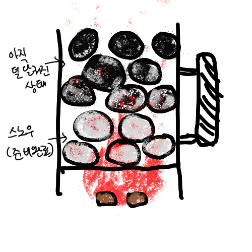 그럼 그 때 밑에 숯과 위에 숯의 발화시간이 차이나서 한번 뒤집어주라는데....