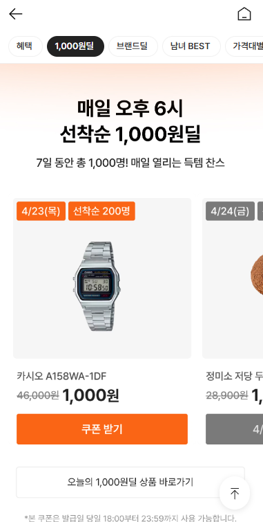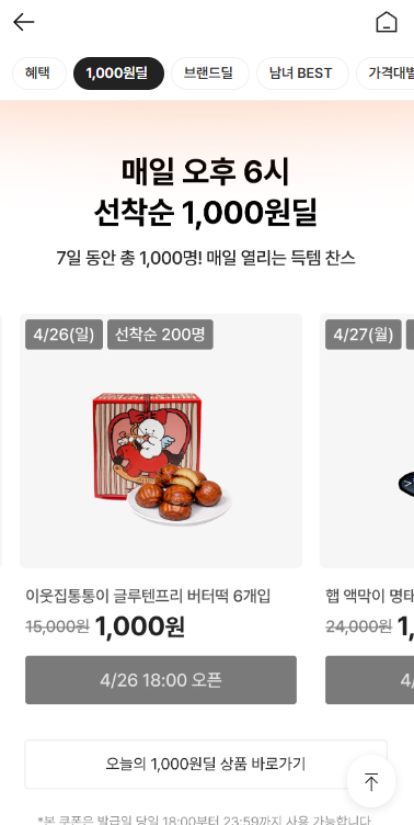 [할인]크림 선물위크 선착순 1,000원딜 작성자등펴진새우|작성시간26.04.23|조회수1,183 목록 댓글 1 글자크기 작게가 글자크기 크게가 https://kream.co.kr/content/15796가격대별 센스있는 선물! 전 카테고리 ~50% 쿠폰매일 오전 11시 랜덤 쿠폰 | 오후 6시 천원딜 오픈kream.co.kr 매일 저녁 6시에 풀린다니까 손 빠른 오리들 ㄱㄱ!!! 난 버터떡 도전해볼라고 ㅎ 다음검색 현재 게시글 추가 기능 열기 북마크 공유하기 신고 센터로 신고 댓글 댓글 1 댓글쓰기 답글쓰기 댓글 리스트 작성자햇단콩밤콩 | 작성시간 26.04.23 오대박...내일 도전해봐야지 댓글 전체보기