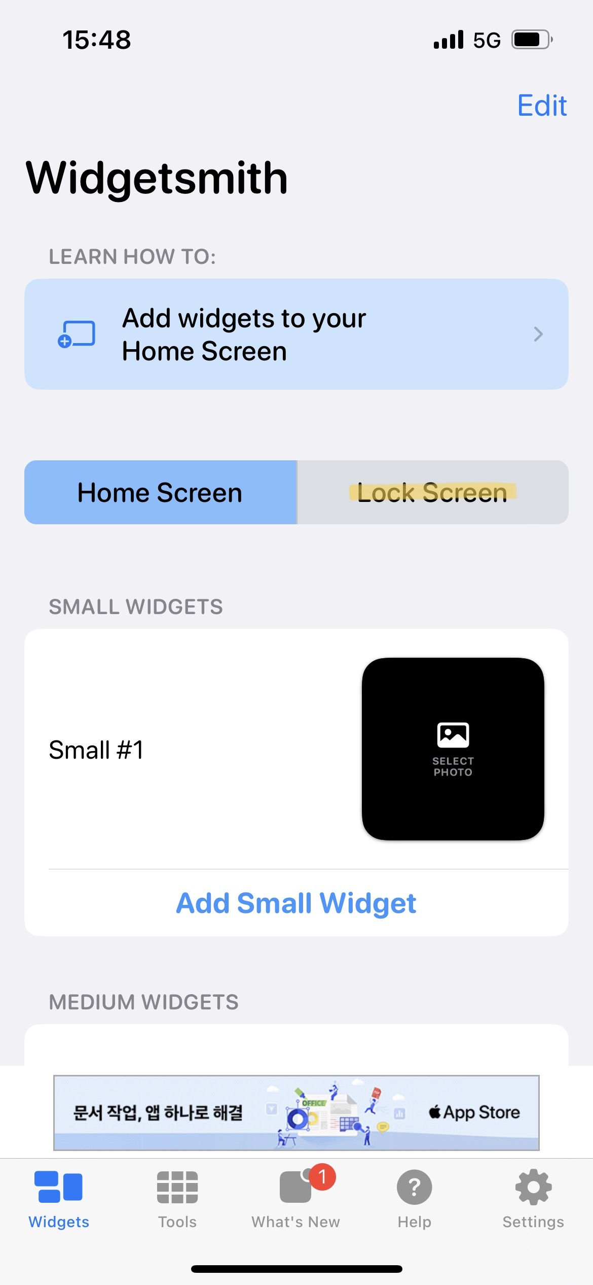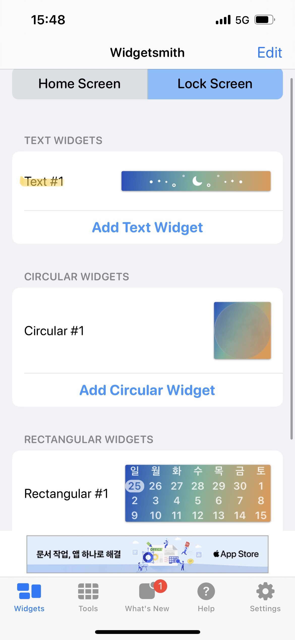 1. Widgetsmith에 들어가면 Home Screen 말고 Lock Screen 선택
