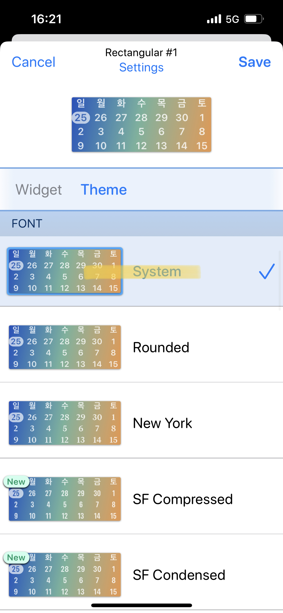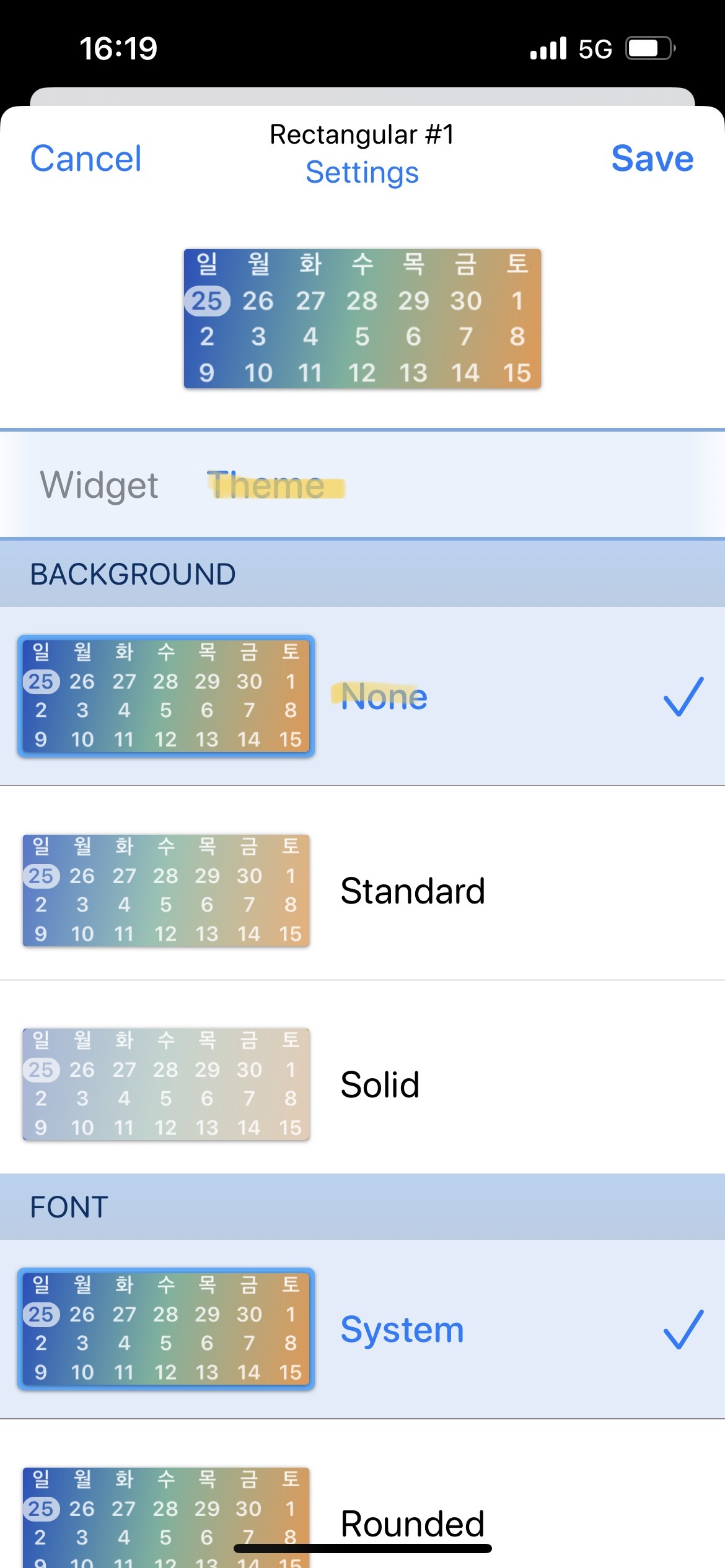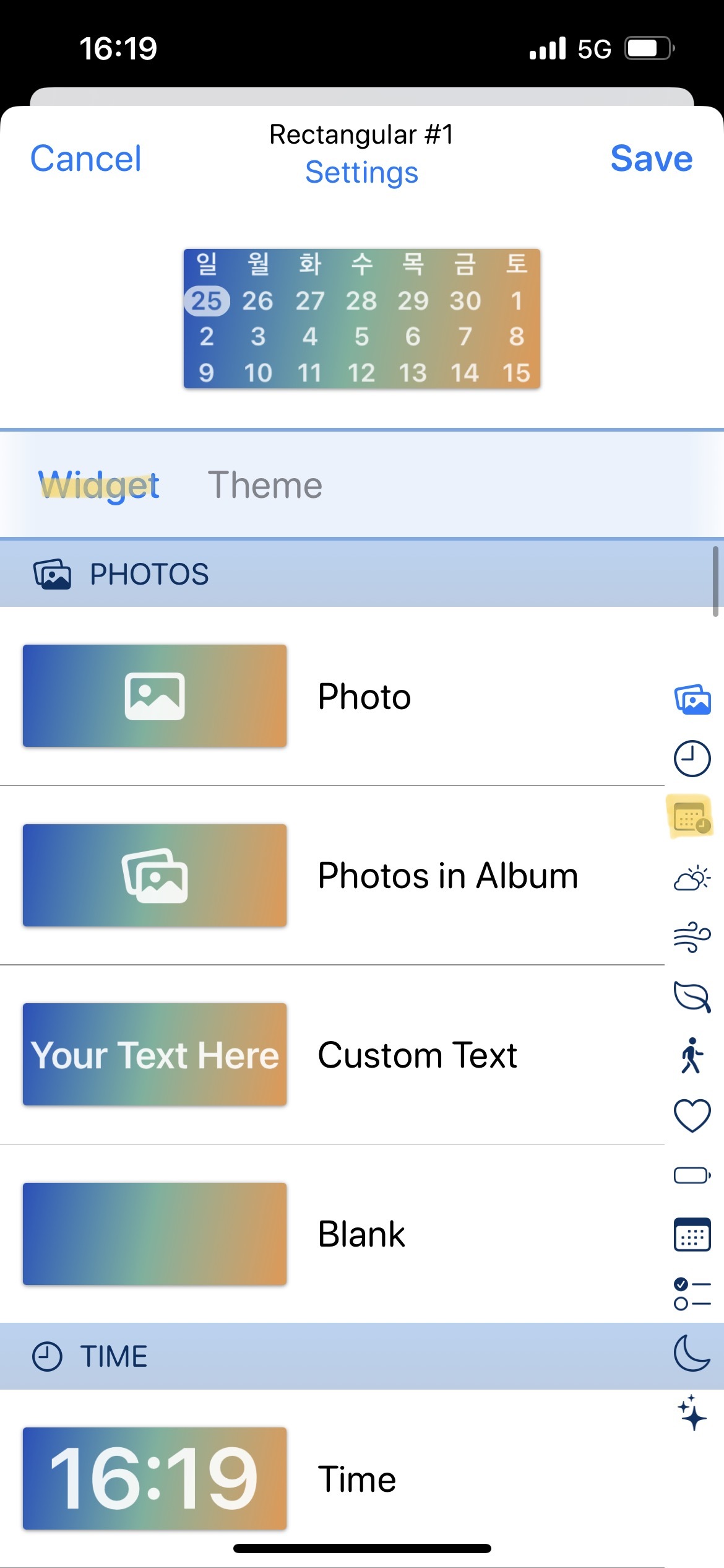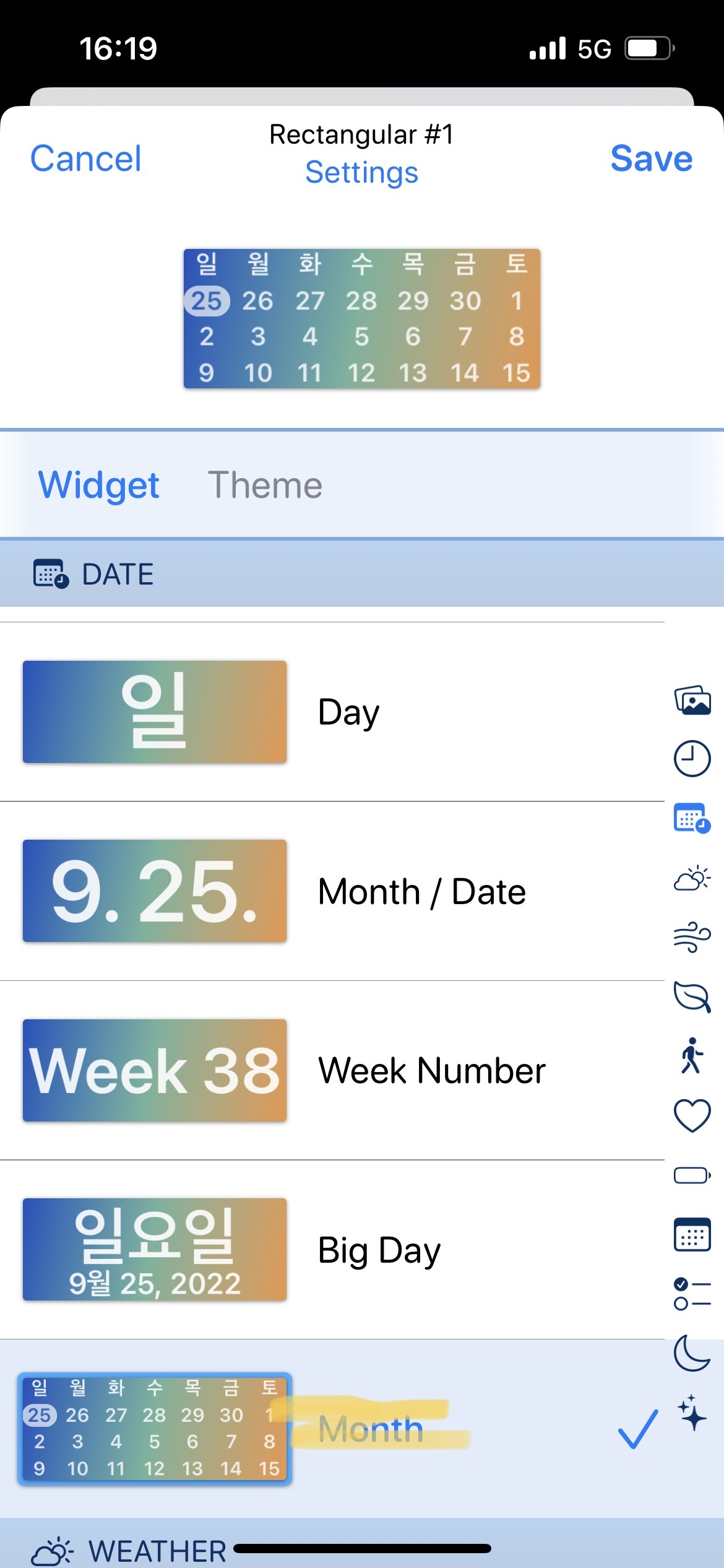 1. Widget 에서 오른쪽에 보이는 달력(DATE) 모양 선택