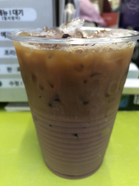 1. 얼음컵에 초코우유 붓고 아메리카노 추출 누르시오.