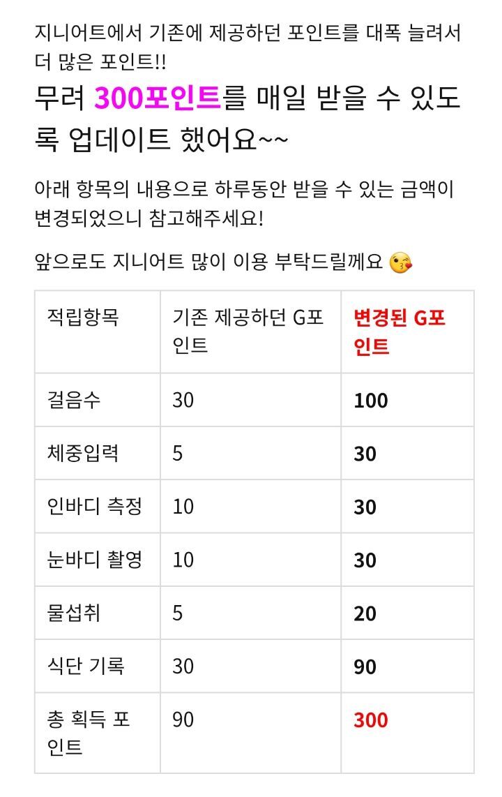 기록하는거 시간 많이 소요 안돼고 대충 클릭만 몇번 해주면 물마시기 식단 기록 등등 다 가능하니까 웬만하면 300포씩 받아가!!!! 그것도 귀찮으면 걍 100포씩 걷는걸로도 적립 가능!