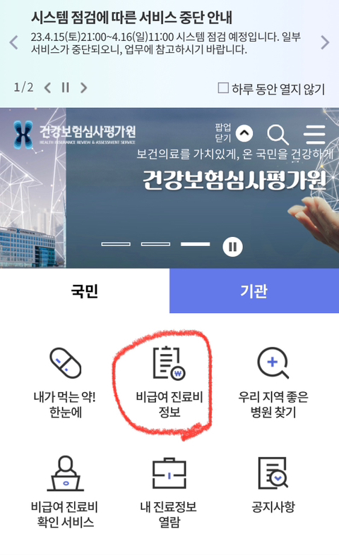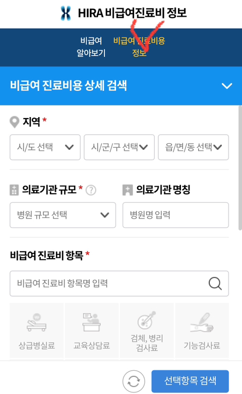 상단에 ‘비급여 진료비용 정보’ 클릭