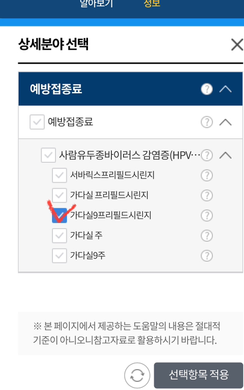 ‘사람유두종’ 검색하면 저런 창이 뜨는데 ‘가다실9프리필드시린지’체크